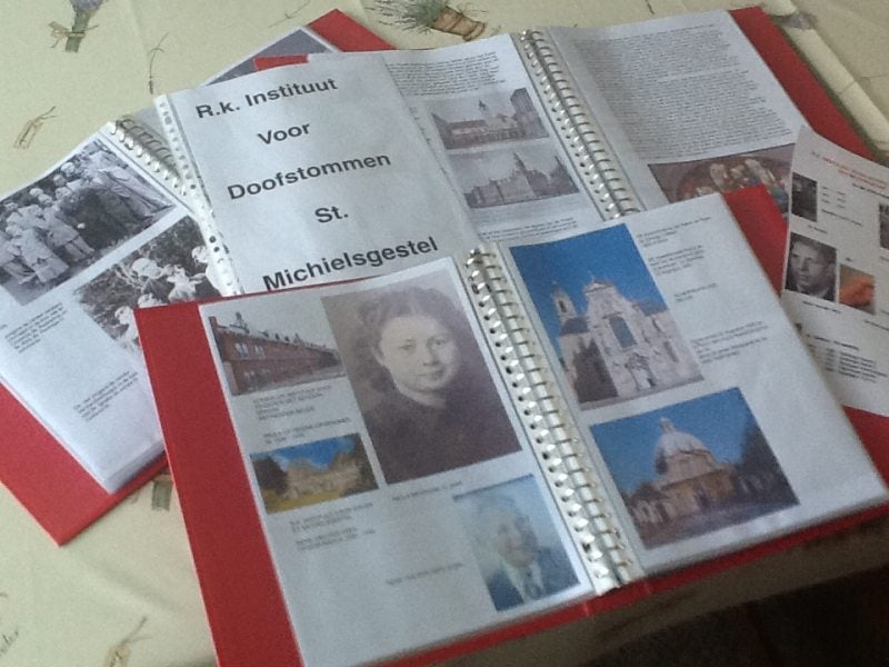 de vergelijking van mijn de boeken in 4 delen dat ik heb geschreven over R.K. Instituut voor Doofstommen St Michielsgestel en ook naar de andere landen de Doofstommen/blinden Instituut in Parijs, Luik, Maaseik, Hasselt, Brussel, Namur, Brugge, Antwerpen, Lepzig, Wonosobo, Tobora, en Malwai. helemaal in de boek heb geschreven. Van uit dat ik op Ivdvariatie heel veel het verhalen over het instituut wat ik daar heb meegemaakt dat heb ook in de boek geschreven. Nog wat verder schrijft over de doofstommen instituut in Amerika, Engeland, Spanje, Zweden, Dennemarken, Finland, Rusland, Zwisterland, Oostenrijk Italie en Afrika in boek dat zal veel kosten tijden vergen. Zie de foto op de boek staat een groot foto van mijn vrouw Paula dat ze van haar leeftijd 12 jaar op het Doven en Spraakgebreken Instituut in Antwerpen zie de foto linksboven. Toen ze het laatste bij het horende school heeft gezeten van 1940 ---- 1946 daarna werd zij het instituut voor Doven en Spraakgebreken in Antwerpen van 1946 --- 1954 dat alleen voor het leren van liplezen en ook het bijvak van het gebarentaal. Zij was een hardhorende, later de slechthorende. Daar op het instituut heeft ze in het jaren heel goed en gelukkig geleefd en ook goed onderwzen door de leraarers. Zij mocht in het weekend naar huis van vrijdagmiddag tot met maandagmorgen voor 9 uur. Ze vertelde mij dat daar heeft helemaal niets mishandeld, maar wel de straf voor de pauze niet naar het buiten spelen, op papier met 100 of iets meer hetzelfde naar de zin schrijven en ook in de hoek staat. Zo mooi hoor! Op het schooljaar slaagde ze de diploma van het naaister en het voorgoed naar huis ging. Let op!!! Toen de Directeur Mhr V Eijndhoven in 1991 aftrad en vertelde hij aan mijn vrouw Paula dat hij werd benoemdt tot het bestuur van het instituut voor doven en spraakgebreken in Antwerpen en zeide hij dat daar was het waardeloos. O wat van hem het woord hoorde ik helemaal niet netjes. maar zeide ik het was de andersom. En de onderkant foto dat ben ik Rene' en de naast van hem het R. K. Instituut voor Doofstommen te St Michielsgestel daar het leven van mij dat ik al in Ivd Variatie het verhalen heb geschreven. Van te voren dacht ik dat het eerste doofstommen instituut was opgericht in Parijs, maar ik ben iets achter gekomen dat In Zweden was het eerste Doofstommen Instituut opgericht, maar ik zal proberen informeren of dat klopt wel of niet. In Belgie bestaat wel oude doveninstituten nog dat heeft het goed gespaard en ook in Nederland het doveninstituten hebben