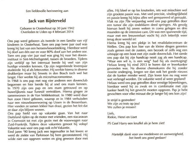 597. Bid- en dankprint van overleden Jack Bijsterveld